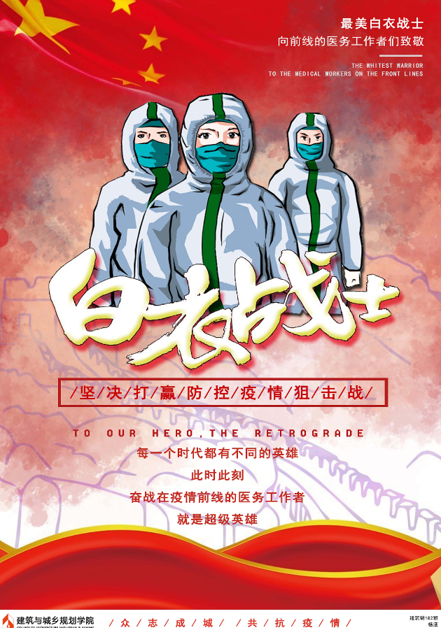 众多作品中,建研191班李鲁黔同学通过强有劲的拳头表达战胜疫情的决心,宣示只要我们万众一心,众志成城,科学防止,定能战胜疫情!建研181班田诺同学别出心裁地采用了手绘形式,终南山团队坚定的神态令人鼓舞,飘扬的国旗振奋人心。建研182班刘阳同学以中国地图为背景,暗喻受创的湖北省正在全国支援下一点点被治愈,并发出“对口支援,共克时艰,中国,一点也不能少”的心声。也有不少同学表达了对白衣战士的敬佩,对拒绝野味的决意,表达了隔离病毒、不隔离爱的心态。