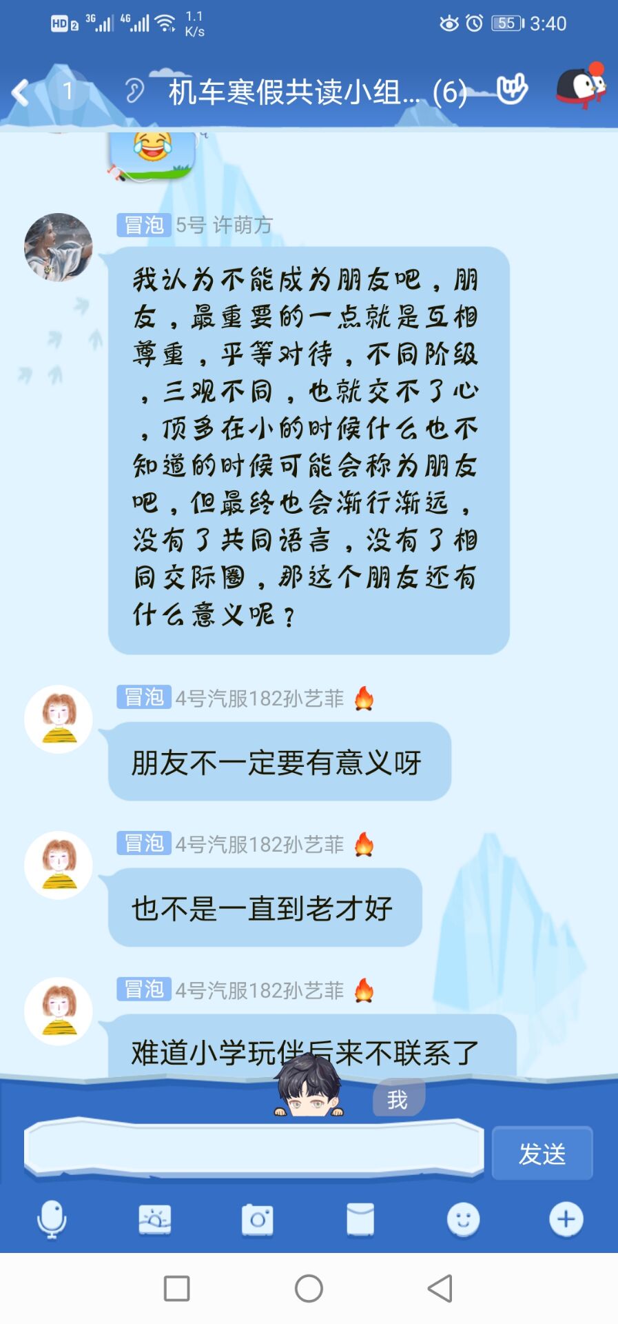 活动自发布以来,得到广大同学的积极参与,经过筛选,20名来自不同班级、不同专业的读书爱好者入选第一期共读小组成员。在为期两周的时间内,分成4 个小组,共读4 本由老师们推荐的书籍(《追风筝的人》、《月亮与六便士》、《围城》、《人生》),分享讨论了“理想”、“友谊”、“生活的意义”等八个不同的主题,完成了五千字左右的阅读“输出”。大家一起梳理斯特里克兰人生痕迹来探讨生活的意义,共同辨证高加林自我实现需求的正确性,在“城楼”上观望“进与出”的人们。在“生活的意义”主题讨论中,交运191的韩雪表示:“生活的意义应该是体验这世间的美好,来自亲人的关爱,朋友间的友谊,情侣间的爱情及旅途的美景,每一个都令我十分向往,偶尔写一段文字,晒一下朋友圈,不是为了炫耀,只是用来表达我生活的意义。”