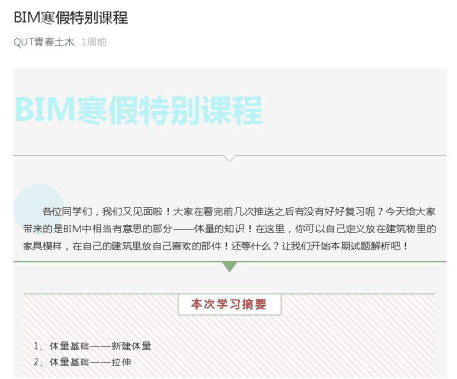 “BIM寒假课程”同样激起了同学们学习BIM的热潮,利用“青理BIM爱好者协会QQ群”、学院微信公众号“QUT青春土木”等,每周定时推送相关的培训、BIM基础课程教学视频及BIM等级考试试题,让更多同学了解BIM建模概况,特别是结合火神山医院、雷神山医院进行建模,让同学们树立专业自信,感受到BIM学习的魅力和挑战自我的乐趣。