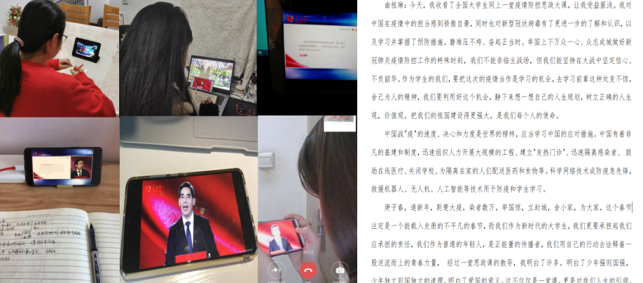 学生们通过这堂思政大课感受颇深,分团委委员、英语172团支书黄钰同学感受到在这场疫情大战中,“一方有难,八方支援”的中华民族无比强大的凝聚力。士不可以不弘毅,任重而道远。作为一名学生党员、学生干部,会把爱国作为最大的责任担当,带头践行初心使命,以身作则,为坚决打赢疫情防控攻坚战贡献自己的一份力量!学院学生会权益部部长、社工182徐荆鑫激动地表示今天的思政大课让其学习到,对于实现中华民族的伟大复兴来说,这次疫情是一次具有新的历史特点的伟大斗争。作为大学生,应该把这次的疫情当作是一种学习的机会,把爱国当作最大的责任担当,拥有忧患意识,学习前辈处变不惊、舍己为人的精神,明确自己的人生规划,用我们的青春奋斗担当起时代的责任。