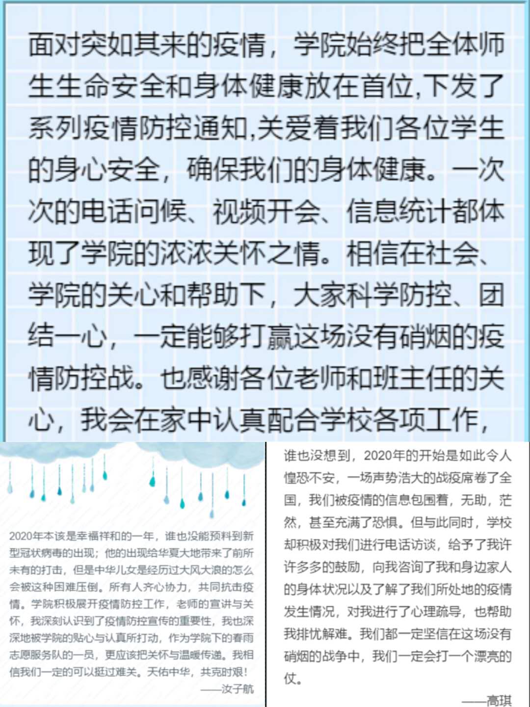精准帮扶,伴你成长。延迟开学,不延迟爱与关怀,为了解贫困学子的情况,学院实时动态掌握受疫情影响的经济困难学生基本情况并及时予以精准帮扶。学院关怀之下,学子颇多感悟,志愿服务队收集来自学院关怀之下贫困学子的感悟投稿。