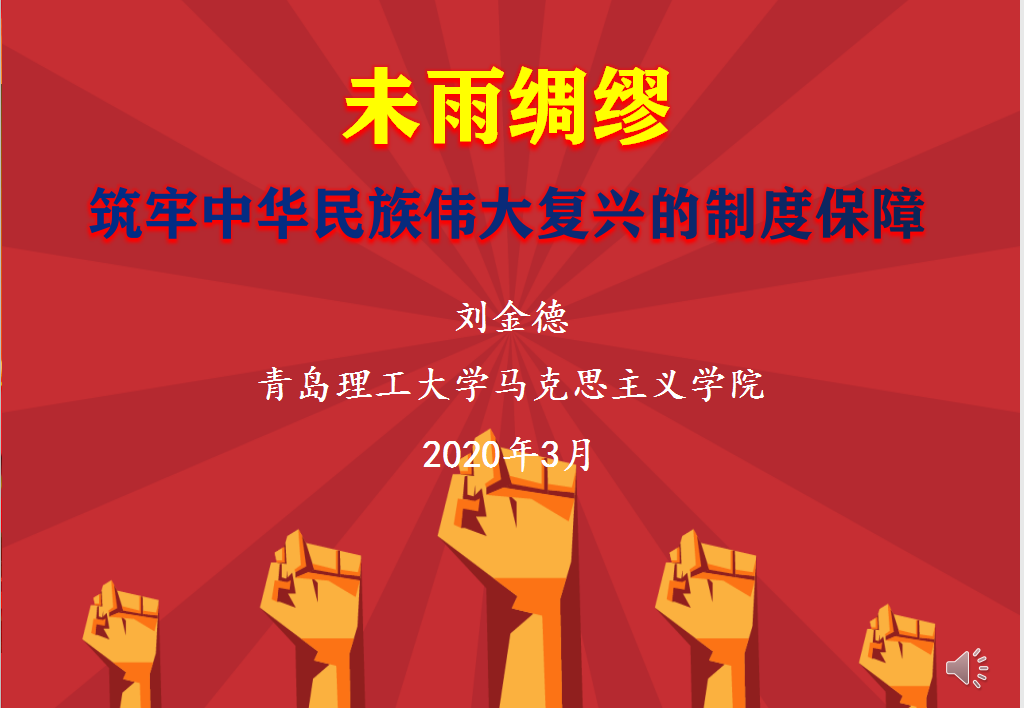 刘金德结合习近平总书记发表于《求是》杂志《全面提高依法防控依法治理能力,健全国家公共卫生应急管理体系》的文章,以“未雨绸缪——筑牢中华民族伟大复兴的制度保障”为主题,深刻剖析十九届四中全会召开的重大意义,深入解读党中央关于疫情防控的决策部署,透彻分析中国特色社会主义制度和国家治理体系的显著优势,集中讲述健全国家公共卫生应急管理体系对于疫情防控的重要意义,积极引导学生认真学习贯彻十九届四中全会和习近平总书记在抗击疫情期间的系列重要讲话精神,强调同学们要在守正创新、开拓进取中坚定“四个自信”,增强“四个意识” ,做到“两个维护”,为坚持和完善中国特色社会主义制度、推进国家治理体系和治理能力现代化,实现“两个一百年”奋斗目标、实现中华民族伟大复兴的中国梦奉献自己的青春力量。
