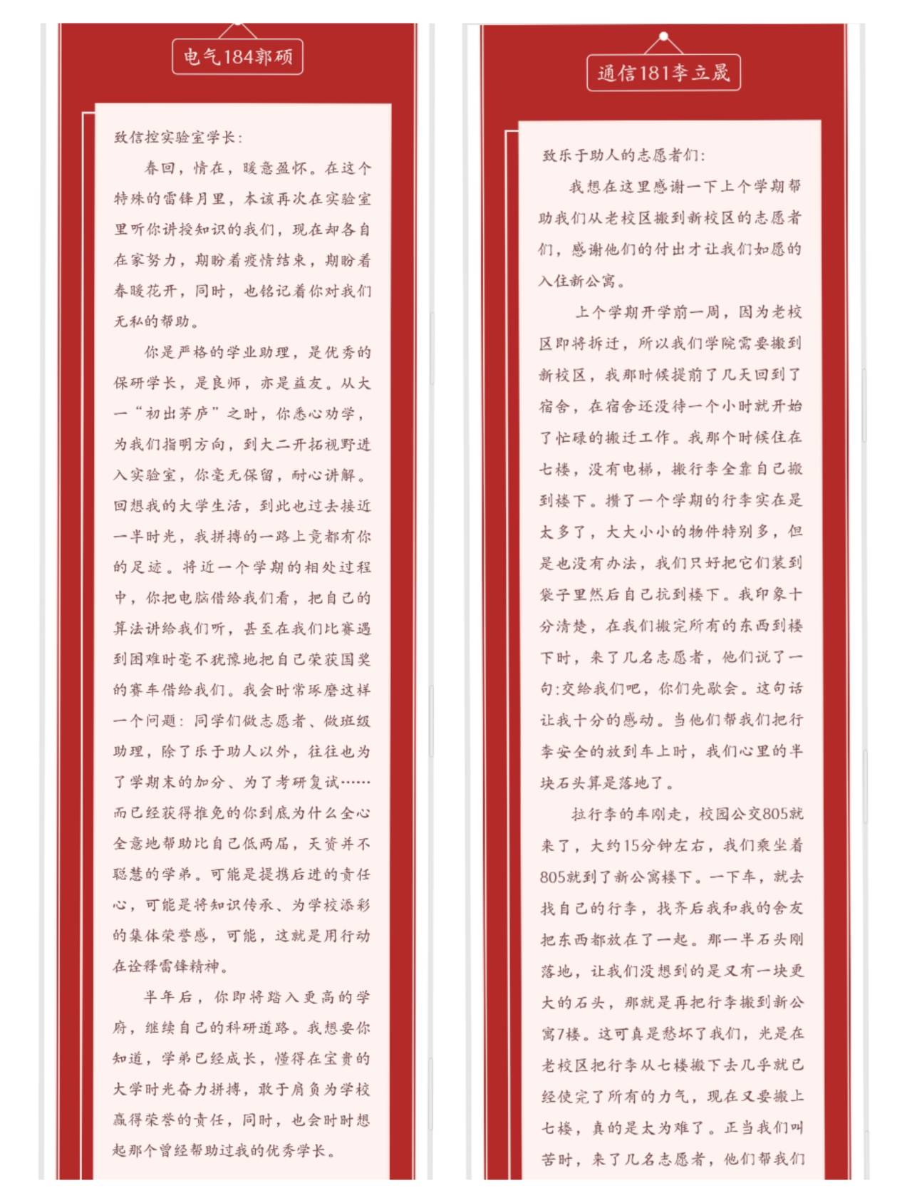 活动一经展开,同学们踊跃参与,短短几天,易班工作分站就收到了来自各年级同学共50余份作品。平凡的工作亦有不凡的表现,信息181张炜卓向身边的保洁阿姨表白,他在信中说到,是保洁阿姨每天的辛勤工作与付出才有我们校园的美丽,在他心中保洁阿姨就是我们身边的雷锋;雷锋精神也常伴在身边,电气184郭硕表白实验室学长,他时刻铭记着学长无私的帮助,回忆起自己在学长的帮助下一步步的进步,他明白学长的无私帮助就是落实雷锋精神最好的写照;自动184郝宇婷表白自己的舍友,她的舍友马瑶瑶经常参与志愿服务,用自己的行动来温暖孤寡老人的心。还有通信181贾宁禹、通信181李立晟他们的作品也表达了对自己身边“雷锋”的敬意。同学们的作品字里行间都流露出对身边“雷锋”的感谢与赞扬。