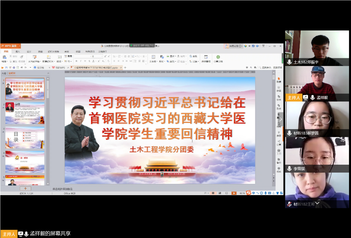为学习贯彻习近平总书记给在首钢医院实习的西藏大学医学院学生重要回信精神,提高政治站位,统一思想认识。3月15日,土木工程学院分团委召开线上集体学习会议,学院分团委委员及2018、2019级团支书参加,会议由分团委副书记孟祥毅主持。