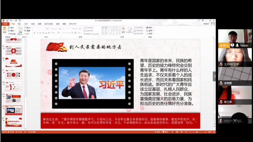 土木182班团支书邢振宇带领大家一起重温了习近平总书记的回信内容,对总书记回信展开进一步学习。通过品读回信内容、领悟回信精神、观看藏区工作者对于回信的理解及学院优秀学子在疫情期间服务社会的生动事例,鼓励青年学子响应习近平总书记号召,到人民最需要的地方去。与会人员纷纷表示要向身边榜样学习,造福人民特别是基层群众。要以学习近平总书记回信为契机,更好的团结引领全院青年学生,坚定不移听党话、跟党走,在服务中引领,在引领中服务,不忘初心,砥砺前行。