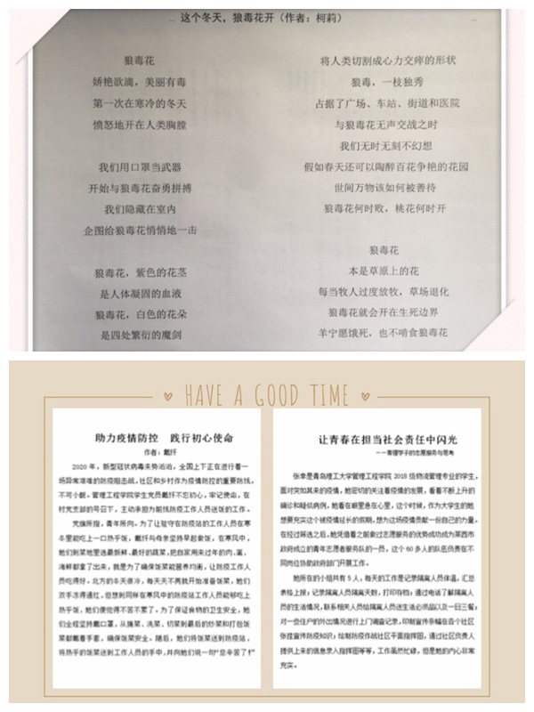 通过诗歌、散文形式展现疫情防控期间我院师生的所感所悟,展现战“疫”必胜的信念。柯莉老师借助“这个冬天,狼毒花开”诗歌作品,呼吁人类热爱自然,保护环境,善待生命。我院学子张幸、戴迁作为青年志愿者,不忘初心,牢记使命,助力疫情防控。该活动充分展示了我院师生在疫情防控期间勇挑重担的思想自觉和行动自觉,引领广大女教工争做新时代巾帼奋斗者。