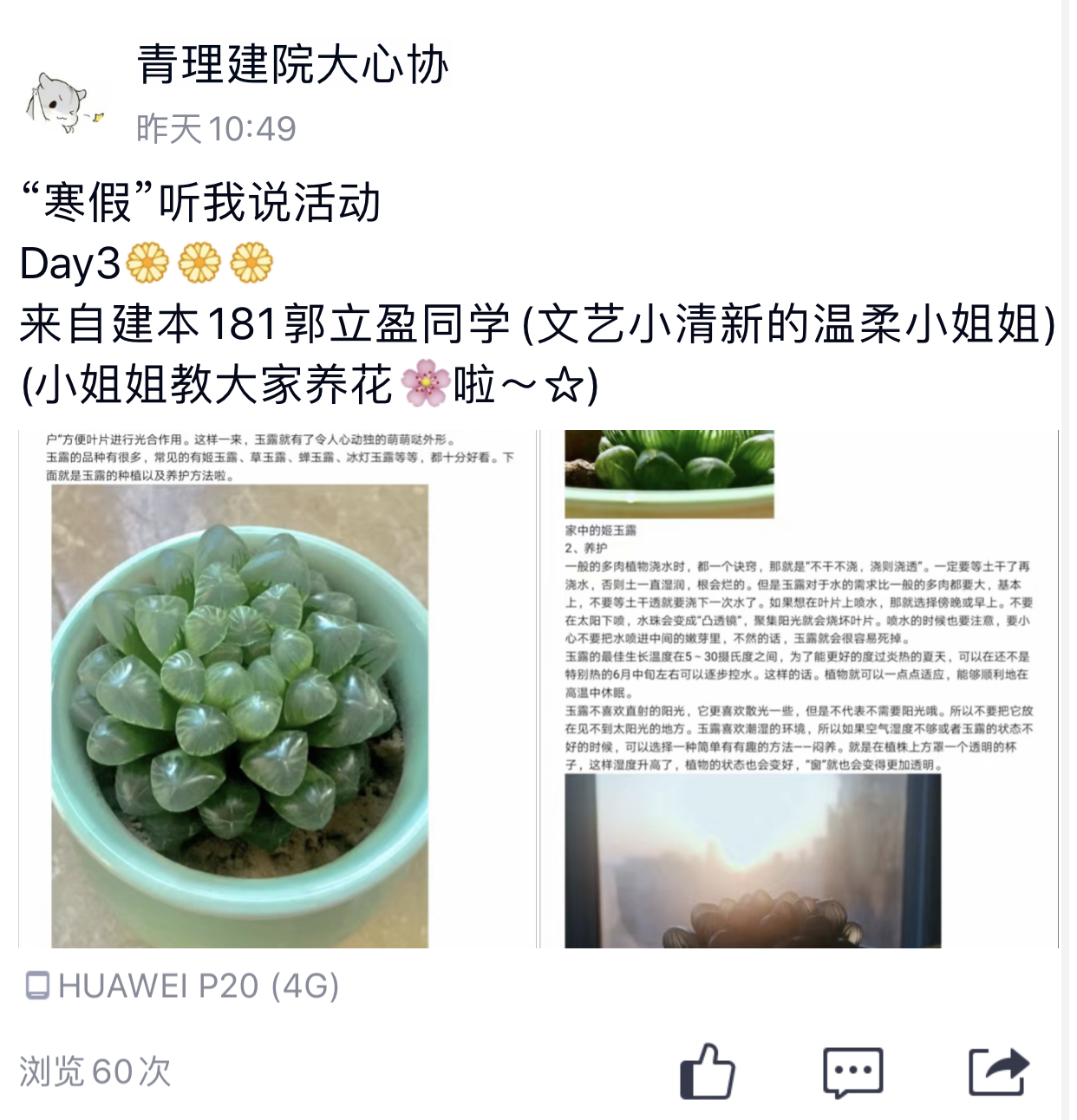同心战“疫”,众克时艰。在参与“百团战‘疫’”为主题的线上防疫活动中,建学193李皓苒表示“非常开心自己能够通过参加社团活动为助力国家打赢防疫攻坚战贡献一份自己的力量,希望社团继续举办活动,吸引更多的人参加。”建学181胡苏宁转发青理大心协关于艾立雨的假期分享,并配文“人美心善”,传播抗击疫情正能量。建学191郑哲宁表示“营造社开展的特色抗‘疫’活动十分有趣,从中感受到了大家抗击疫情的团结力量,相信只要大家团结一心,众志成城,就一定可以早日战胜疫情。”