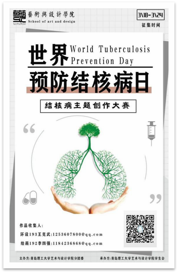 2020年3月24日是第25个世界防治结核病日,艺术与设计学院举办了“携手抗疫防痨、守护健康呼吸”主题创作活动。号召和动员全体同学行动起来,深入开展防空疾病宣传教育,抗击新冠肺炎疫情、遏制结核病流行,切实保护同学们的生命安全和身体健康,目前收到学生宣传海报、宣传画、连环画、H5、手绘、文章等作品二十余幅。
