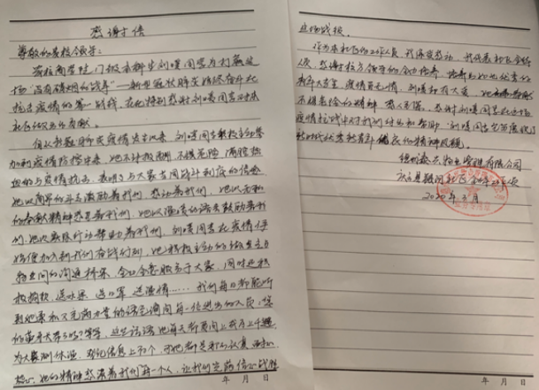 刘暖的奉献、坚守、高度负责的工作态度感动着社区防疫小组的每个人,社区疫情防控组特别为刘暖送去了感谢信,信中提到:“感谢校方领导的全力培养,培养出如此优秀的青年大学生。疫情无情,刘暖却有大爱,感谢刘暖同学在疫情阻击战中对我们的付出与帮助。”
