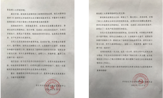 由于李海桤在社区防疫志愿工作中表现突出,安丘市兴安街道永安社区、中共安丘市兴安街道永安社区委员会特向学院寄来感谢信,信中提到,“该同志积极响应、逆行冲锋,迅速投入到这场攻坚战中,与我们并肩战斗,表现出不畏艰险、砥砺奋进的责任担当,也表现出热情服务、甘干吃苦的为民情怀民。”“该同志舍小家为大家,用平凡善举帮助他人、温暖人心、传递希望,赢得了社区群干的一致好评!”