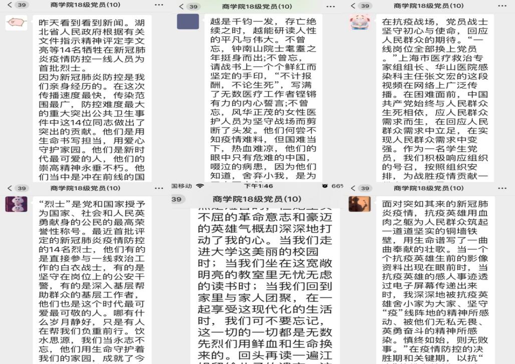 活动伊始,大家观看《革命先烈英勇事迹》的视频,通过回顾历史,重温英雄事迹,让支部成员真切地体会到中华大地,无数革命先烈、仁人志士,为了人民的幸福、民族的解放和国家的富强,在硝烟弥漫的战场上,英勇战斗,用殷红的鲜血,书写了爱国主义最壮丽的诗篇。商研192班张玺说:“我们应满怀感激的心情,永生铭记老一辈共产党人为民族独立、人民解放英勇斗争的革命精神,沿着老一辈共产党人留下的脚印,发扬革命精神,以朝气蓬勃的创新活力、英勇无畏的责任担当、积极热血的青春风采,投身同心筑梦的伟大奋斗。”