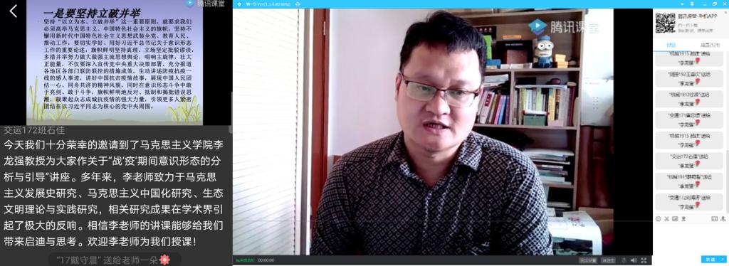 为了弘扬爱国主义精神,培育爱国主义情怀,做好爱国主义教育。近日,机械与汽车工程学院“初心理论”学习社举办主题讲座活动。邀请马克思主义学院李龙强博士通过“腾讯课堂”APP开展线上专题讲座,解读中国为什么能够迅速控制住武汉疫情,分析中国特色社会主义制度的显著优势,引导学院学生树立战胜疫情的信心与决心。学院共计226名同学参加此次线上专题讲座。