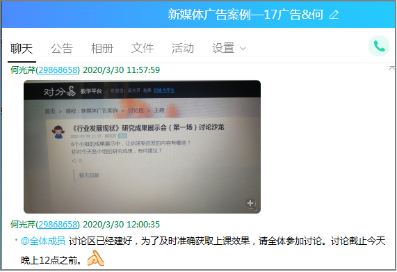 周一上课之前,在“新媒体广告案例”课程QQ群中,对本节课的具体安排和注意事项进行预告,并重点提醒了教学平台的变化。
