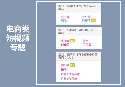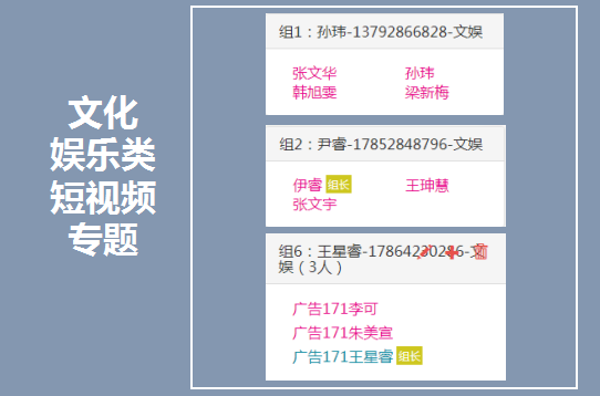 根据各团队提交的《***类短视频行业发展现状剖析》,首先从文化娱乐类短视频和电商类短视频两个研究专题中,精选了6个团队成果进行课堂展示。