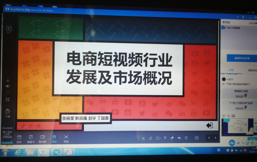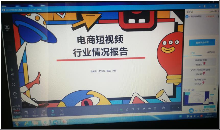 2020年3月30日(周一)3-4节,《新媒体广告案例》第二周教学活动在腾讯课堂准时进行。本周教学内容为“阶段性课堂汇报(第一场)——《文化娱乐类/电商类短视频行业发展现状剖析》研究成果分享会”。整个教学过程共分为四个部分: