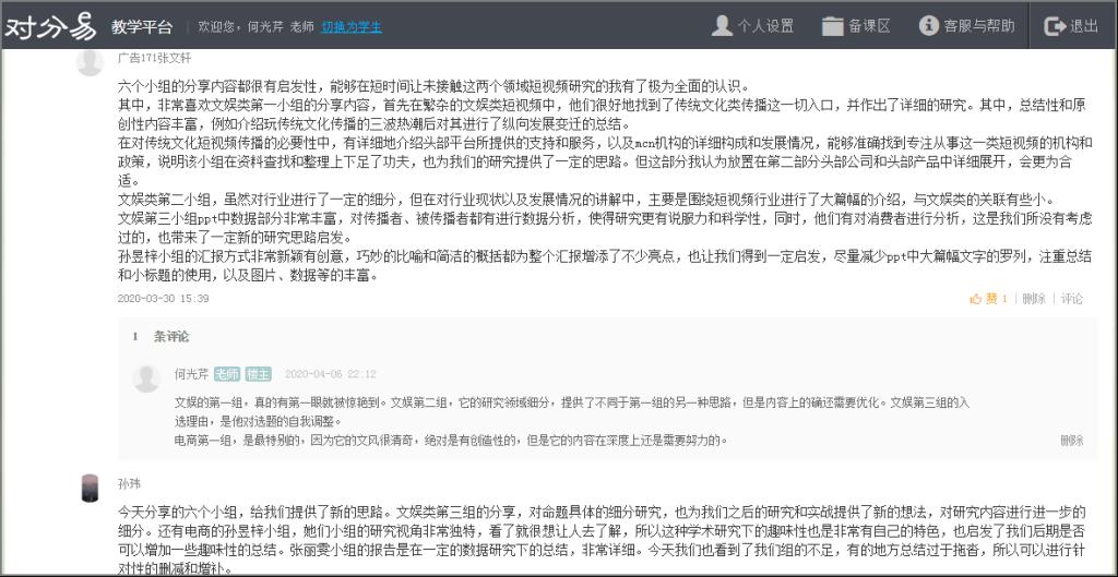 各团队从正式开课之前的在线辅导阶段,就已经着手进行探究式研究了,此前还在课程QQ群围绕文献资料收集和分析做过两场专题分享和讨论。所以在上周课程结束时,要求各团队在课下完成***类短视频行业发展现状部分的研究,并于第一周周六之前将研究成果,提交到对分易课程平台中的作业版块。