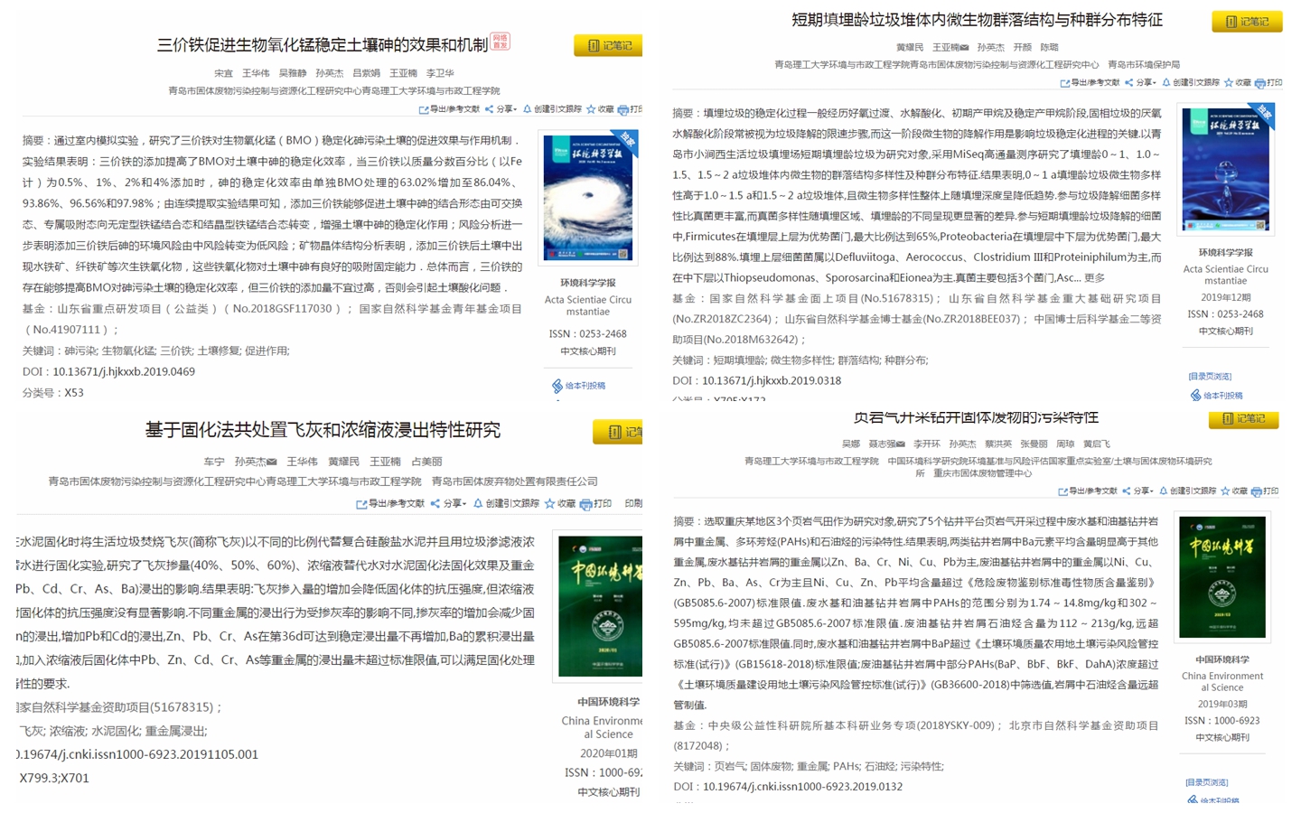 其中,车宁和吴娜在《中国环境科学》分别发表了题为《基于固化法共处置飞灰和浓缩液浸出特性研究》和《页岩气开采钻井固体废物的污染特性》的学术论文,黄耀民和宋宜在《环境科学学报》分别发表了题为《短期填埋龄垃圾堆体内微生物群落结构与种群分布特征》和《三价铁促进生物氧化锰稳定土壤砷的效果和机制》的学术论文。