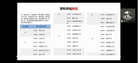 结合自身经历,各位主讲人在交流会中讲述了南京大学、哈工大等高校的复试流程、复试快题的注意事项,提醒同学们作品集的排版尽量与报考院校的风格的选择的一致性,还介绍了建筑学考研的“老八校”和“新四军”以及中国建筑学学科评估排名,解答了同学们关于择校问题方面的疑惑,也为大家分享了自己的研究生生活,打消了部分同学的思想顾虑;关于考研,建本143班的赵伯伦还讲到了英语口试的重要性,提醒同学们在日常生活中要注意专业英语词汇的积累。