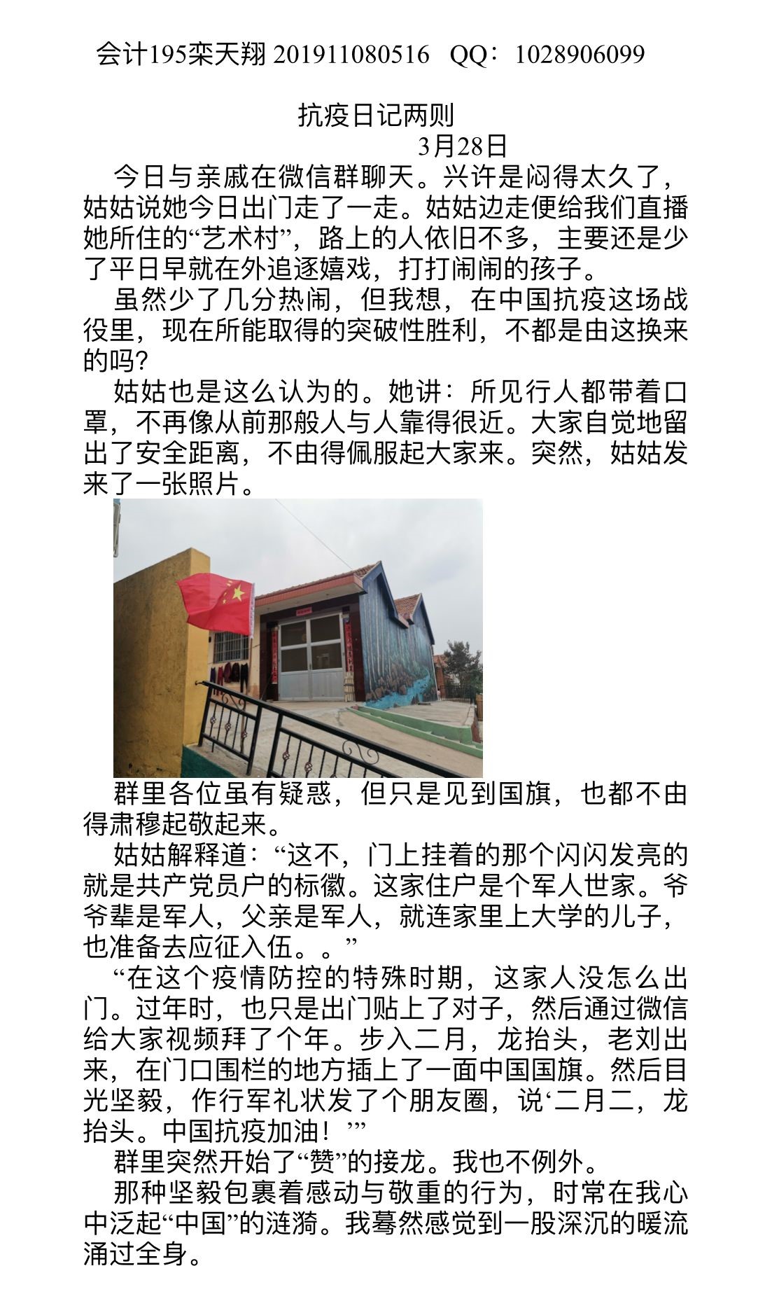 经过后期评选,涌现出众多优秀作品。其中,会计195班栾天翔同学在日志中记录了这样一句话:“居民们自发走上街头,挥舞着鲜艳的国旗,夹道欢迎诸城抗疫队英雄凯旋归来的场景让我不禁鼻尖一酸”;经济181班荆冰洁同学利用日志记录她作为一名抗疫志愿者的心路历程,她表示:“作为一名大学生,我能做的就是成为一颗螺丝钉,成为一名哪里有任务就去哪里的志愿者”;经贸182班袁晓茵则在日志中致敬逆行而上的抗疫工作者,“正是全国无数的逆行人用自己的实际行动,肩负起责任使命,坚定站在疫情防控第一线,凝聚起众志成城、共克时艰的正能量,我们才能取得抗疫的成功”。