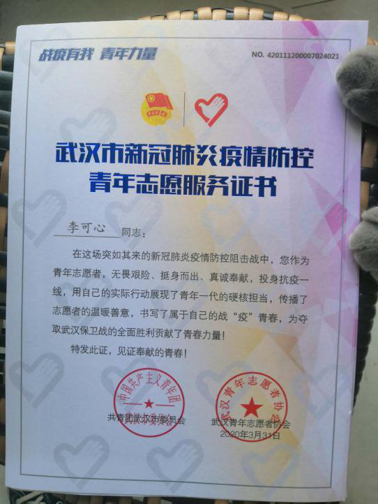 李可心被安排到老人中百仓储南湖购物广场店进行志愿服务,按照“扛包、分拣、称重、打包、搬运、装车”的流程为社区居民准备生活物资,在露天的环境下经常一工作就是一天。而当她回到家,与同样累倒在沙发上“葛优瘫”的爸爸相视一笑后,一种收获感和幸福感油然而生。3月中旬后,学校网课正式开始,李可心忙碌于课程与志愿服务之间,将一切课余时间都投入到志愿服务当中,“当看到市民们排队领取爱心蔬菜开心的神情,再苦再累也值得了。”李可心这样说道。随着全国疫情形势逐渐向好,李可心也在3月31日结束了为期26天的志愿服务。而她默默奉献、坚守岗位、高度负责的态度感动着社区的每一个人,得到了社会的认可,当地志愿者协会特别为李可心颁发了新冠疫情防控青年志愿服务证书。