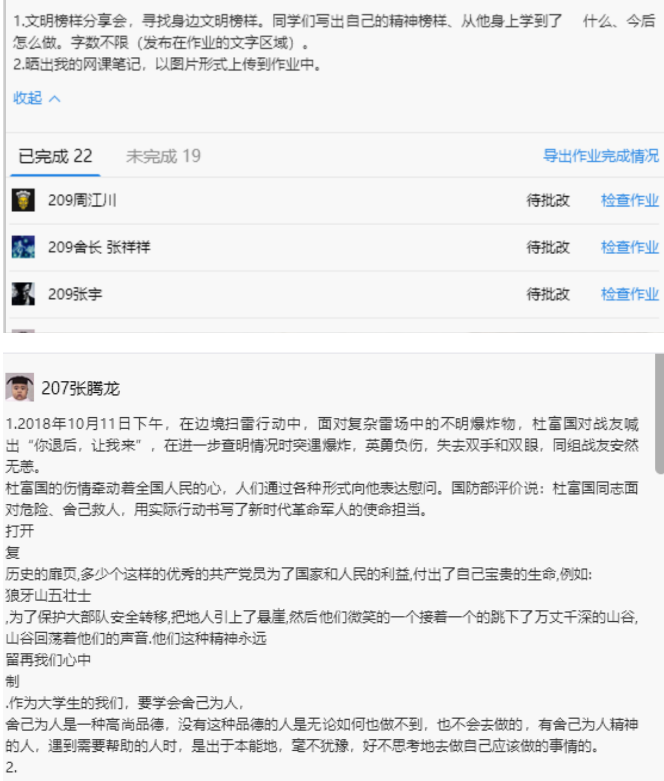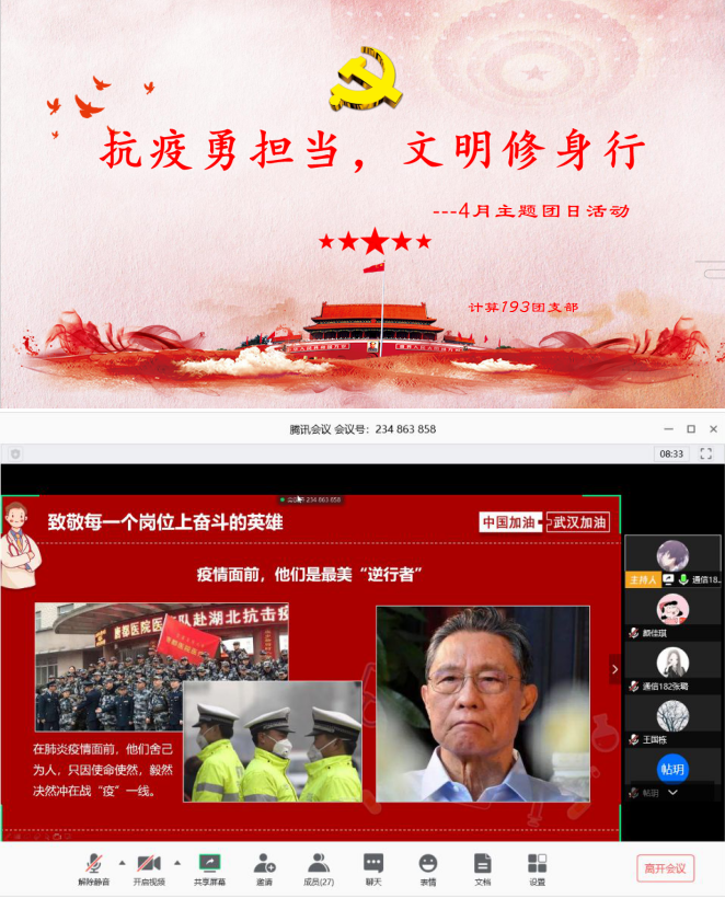 各班级团支部围绕“抗疫勇担当、文明修身行”主题开展了形式多样、丰富多彩的活动。通信171班团支部开展了“文明榜样”分享会,结合“百折不挠、刚毅厚重、勇承重载”的理工精神,带领全体团员学习了疫情期间的文明榜样、先进事迹,旨在使校训精神真正内化为全体学生的行为准则,帮助广大青年团员学礼知礼、修身明德,不断增强文明意识,培育积极健康的精神风貌。特殊时期,新颖的线上教学方式,离不开同学们认真积极的学习态度。自动182班团支部精准把握教育时机,通过到梦空间开展了“晒出我的‘网课笔记’”活动,激发了同学们认真学习、积极进取的精神,营造了良好的学习氛围,固化了学风建设成果。计算193班团支部开展了“文明战‘疫’”主题教育,全班同学分为五组,分别围绕“疫情下,我们该如何爱国”“学习文明榜样人物”“疫情教会我们感恩”等话题进行了一系列的讨论,引导广大团员做自律之人、做文明之人、做担当之人、做感恩之人,切实加强青年团员的道德建设和行为塑造。