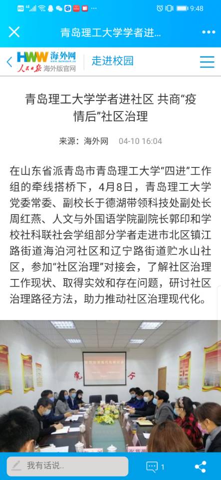 山东省派青岛市365完美体育“四进"工作组的牵线搭桥下,4月8日,学院郭印副院长、社工教研室杨书胜、刘世颖、杨奎臣等老师在学校领导的带领下,走进市北区镇江路街道海泊河社区和辽宁路街道贮水山社区,参加“社区治理现代化”研讨会,了解社区治理工作现状、取得实效和存在的问题,针对两个社区在疫情防控中存在的社区治理问题,结合各自前期的研究成果,就社区治理现代化的路线、途径等发表了各自的意见和建议,为社区治理建立长效机制和找到有效的解决方案贡献了专业力量。