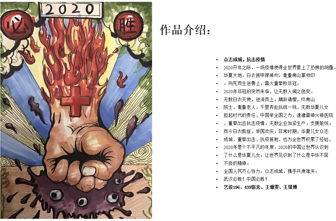 活动开展以来,学院学子以宿舍为单位积极参与,宿舍成员通过qq群等方式一起讨论作品的设计和构思,通过一个周的时间,齐心协力完成了作品。在体现宿舍凝聚力的同时,将个人在抗疫期间的思考和感悟寄托于作品中。本次活动共收到作品72件,最终,5公寓439宿舍创作的作品《必胜》和5公寓412宿舍创作的作品《family》凭借其精妙的构思获得了一等奖。