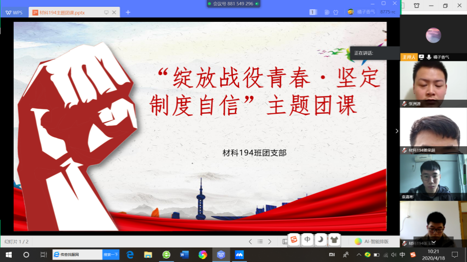 材科194班团支部开展“绽放战役青春·坚定制度自信”主题团课线上会议。会议结合纪念五四运动100周年展开,大家一起收看纪念五四运动100周年的相关视频。并结合“绽放战役青春·坚定制度自信”主题进行了讨论。