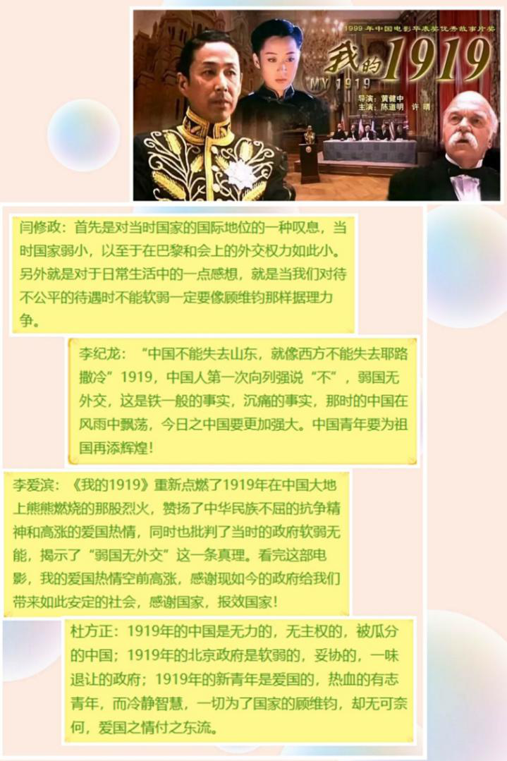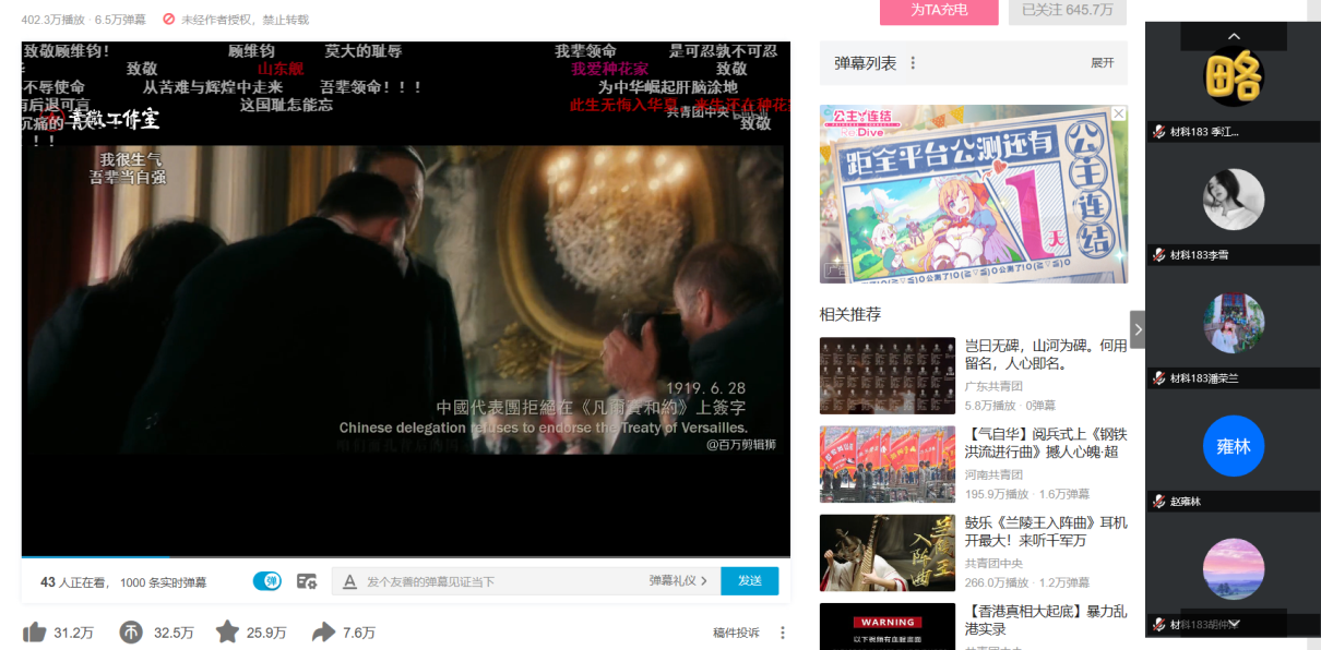 材科183团支部团支书郝梦圆为大家放映了共青团中央发布的纪念五四运动的视频,在班级开展了线上问答题活动,带领大家重温五四运动历程,并一起学习疫情期间涌现出的优秀青年团员的事迹,同学们都表示,要不辱国家使命,增强制度自信,吾辈当自强。