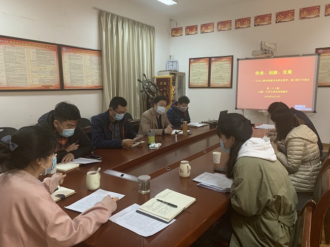 2016级毕业生辅导员左安原介绍了当前学院毕业生考研、就业、出国等方面情况,对当前受疫情影响的大学生就业形势进行着重分析,指出就业就像一面“镜子”,反映出学院学风建设、学生综合素质培养等育人成效;应密切关注毕业生心理状况,加强对毕业生心理健康教育和咨询工作,大家一起认真学习了党和国家关于大学生就业方面的最新政策和要求。研究生辅导员郑猛对当前学院研究生就业现状进行介绍和分析。