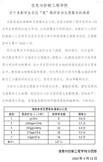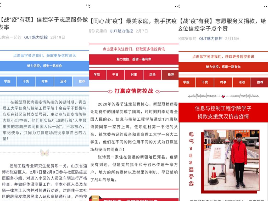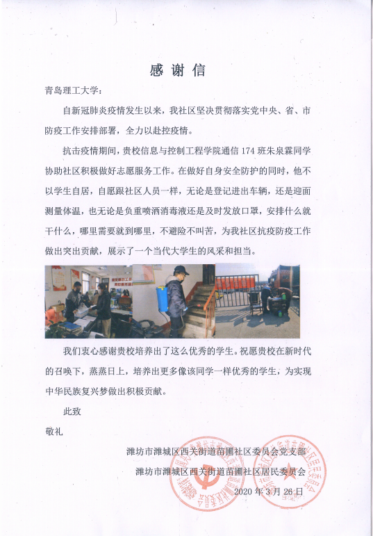 勇者无畏,逆风奔跑最可贵。自新型冠状病毒肺炎疫情发生以来,信息与控制工程学院共有125名学生积极响所在社区及村支部号召,主动请缨坚守在防控岗位,在做好个人防护的基础上以各种形式在家乡参与防控疫情志愿服务,志愿服务时长累计7635小时。他们在寒风中协助社区或村庄设卡测温、物品转运、社区宣传、医疗服务等多个方面的志愿服务工作,涌现出一批展现信控学子优秀素质与责任担当的事迹。其中有多名同学收到当地的表扬信,志愿者事迹被青岛日报和蓝睛等主流媒体进行报道宣传。他们用实际行动践行着“人生最重要的志向应该同祖国人民一起”,不忘初心,牢记使命,共同为打赢这场战役奉献自己的力量。
