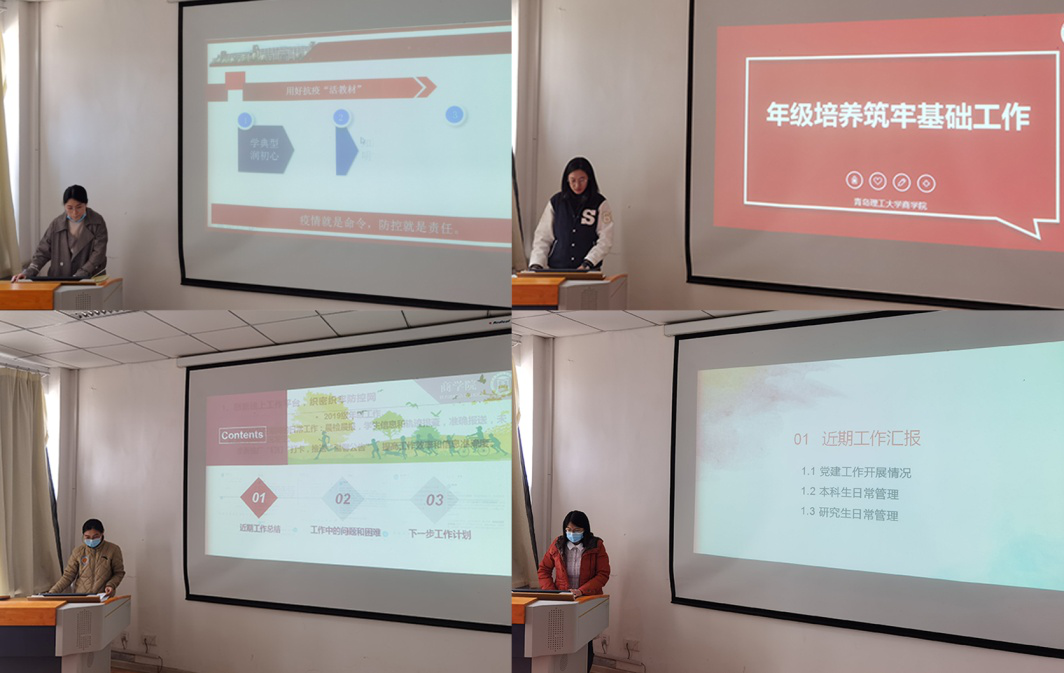 本期沙龙的主题是“新时代学生工作的内容与方法”。各年级长对年级工作进行了梳理展示,全体辅导员按照所承担年级和负责工作项目进行15分钟汇报展示,与会人员对汇报内容进行提问交流。2019级辅导员林丰艳、刘心芝、李靖从“新生的思想教育与严格管理”角度出发,对新生工作进行了总结,并着重对网络思政、学风建设等方面工作进行了汇报展示;2018级辅导员宋颖、杨洪敏、孙楚,从时间和项目两个维度,着重对2018级今年拟开展的重点工作进行了逐一梳理分析;2017级辅导员薛诚、冯宁、臧瑶瑶则基于前期数据调研,分析2017级现存的学风、考研与就业意向,明确了下一步工作重点和工作方向;2016级辅导员孙照、姜圣天、刘奕则聚焦毕业生就业、考研等问题,对新形势下如何更好开展毕业生工作做了详细汇报。