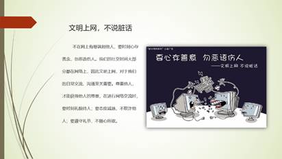 数学191班王璐同学在她的作品中,列举了许多网络中存在的不文明现象。她通过生动的语言、幽默的图片,向我们讲述了网络文明的必要性、重要性,号召我们争做网络文明传播志愿者,净化网络环境。