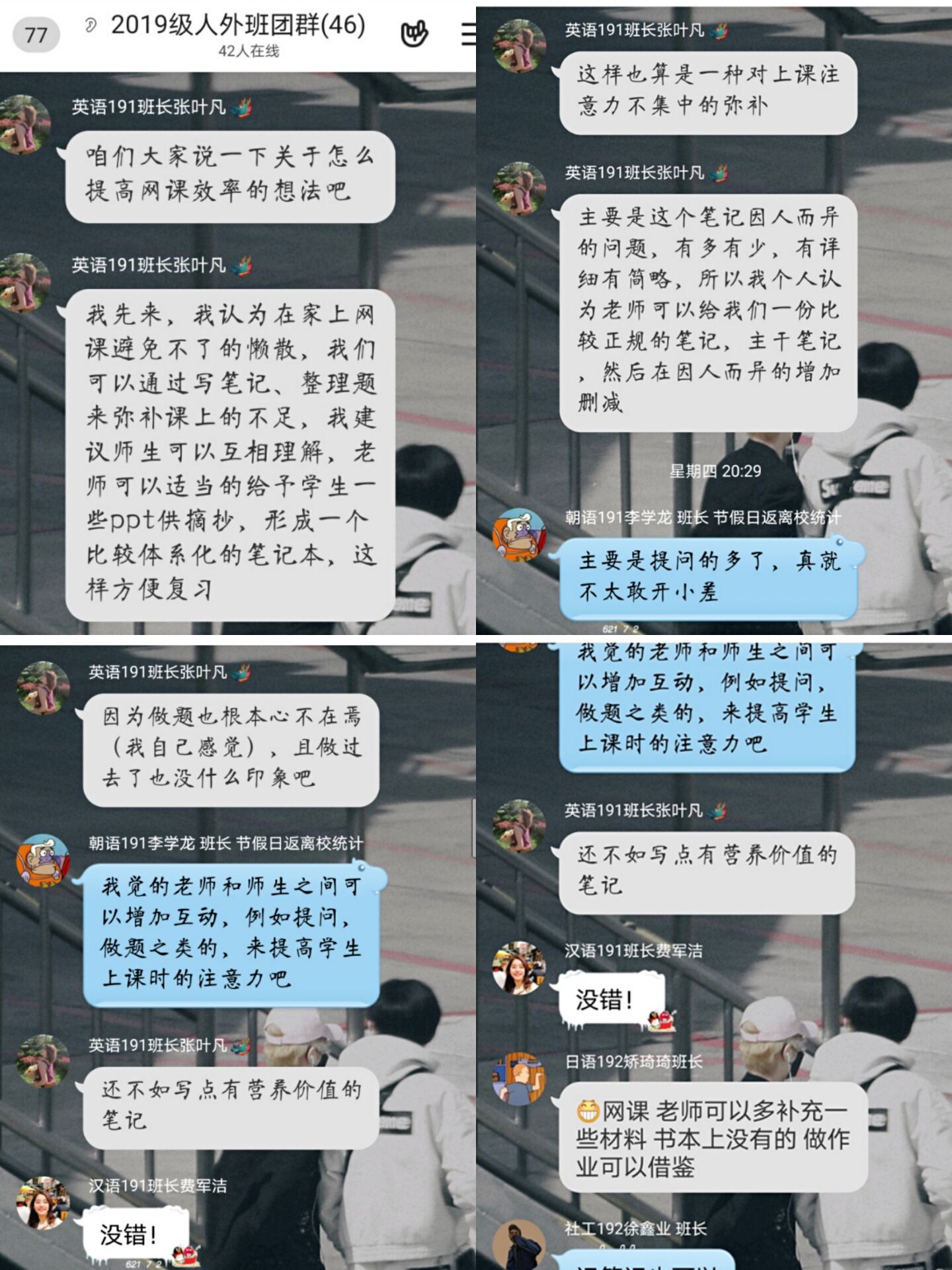为保证疫情期间学生们的学习质量和效果,4月27日晚上,人文与外国语学院围绕如何提高网课效率,保证上课效果等相关议题,通过QQ群组织2019级班团在线上开展了一次抗疫特殊时期、别开生面的学风建设座谈会。 2019级辅导员陈刚参加了会议,会议由英语192班长张叶凡主持,2019级全体班长、团支书参加。