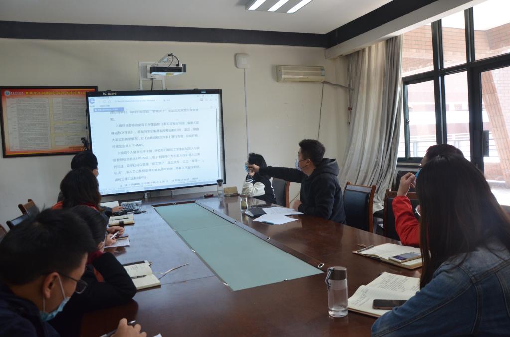 于利俊带领全体成员学习管理工程学院学生防控指南,根据目前学院学生实际情况和学校防控相关文件,再次梳理学生返校流程和相关要点,重点讲解了学生返校后学生管理重点和难点,对学生管理过程中可能出现的突发情况及处理程序进行讨论,提高辅导员在开学后处理突发情况的反应速度和解决能力,为学生返校做好充足准备。于利俊表示学院为开学做了大量细致的部署工作,但疫情面前无小事,学校的一切防控工作都需要每一位同学的积极配合,为让防控工作真正得以落实和发挥效力,辅导员老师必须在开学前期做大量的宣传教育,继续落实两个“百分之百”要求,通过年级视频会议、微信、QQ等多种形式加强对学生的引导教育,帮助学生提高认识,尤其是“五一”假期期间,教育学生尽量减少不必要外出,不扎堆,不聚集,加强自我防护,保证自身安全。(撰稿:王云霞;审核:于利俊)