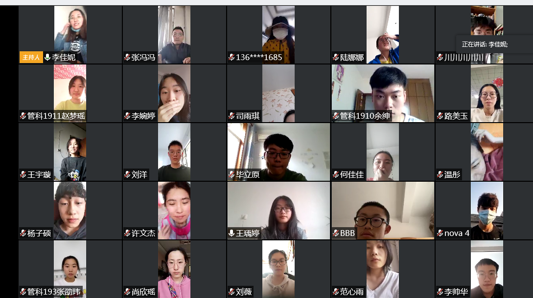 会议第一项,19级各团支部团支书汇报团支部在近期开展的主要工作,各支部在认真做好防疫工作的同时,积极、认真开展各项工作,开展防疫知识讲堂等活动,丰富同学们的居家防疫生活,展现了当代学子的积极向上的良好风貌。会议第二项,辅导员李佳妮讲述五四运动的历史以及新时代中国青年运动的主题,并结合武汉疫情,为学生们解读习近平总书记对青年人的六项要求。会议第三项,学生代表分享五四精神体会。管科191班长周金昊说道:五四运动”绝不仅仅是一个历史事件,它更是一种精神,有着青年人关注国家命运的责任和使命,有着青年人振兴民族大业的赤胆与忠心。作为新时代中国青年,我认为我应该感恩这个时代,珍惜现在美好的学习生活,在自己的学习与生活中用心对待每一件小事,完成好每一项任务,在校园中不断学习与成长,尽自己所能为同学与老师服务,在将来力求以真才实学服务社会,以创新创造贡献国家。信管191班长孟祥昊谈到:五四精神,是忧国忧民、热爱祖国、积极创新、探索科学的爱国主义精神。五四精神始终激励着一代又一代的中国青年不断前进,不断发展,不断创新。正值青年的我们应该学习与弘扬五四精神,有正义感,更要有责任感,有爱国心,更要有进取心。因此,弘扬“五四精神”不应只停留在口号上,更要体现在实际行动上。会议最后,张冯冯结合五四精神,对同学们提出了三点要求:一是做顾全大局、服从安排的“执行先锋”;二是做静气读书、净化心灵的“阅读先锋”。三是做严格自律、笃信好学的“鸿儒先锋”。在超长待机的寒假里珍惜时光,努力学习,做好防疫。胸怀报国志,踏实砥砺行,练就过硬本领,锤炼品德修为。