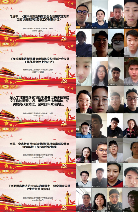 按照《信息与控制工程学院党总支关于2020年理论学习中心组及教职工理论学习安排的意见》的相关要求,4月29日下午,信息与控制工程学院本科学生第二党支部全体党员通过“腾讯会议APP”召开支部会议,深入学习贯彻落实习近平总书记关于疫情防控工作的重要讲话、重要指示批示精神,切实提高政治站位,坚决扛牢政治责任。全体党员参加此次会议,会议由支部书记刘田主持。