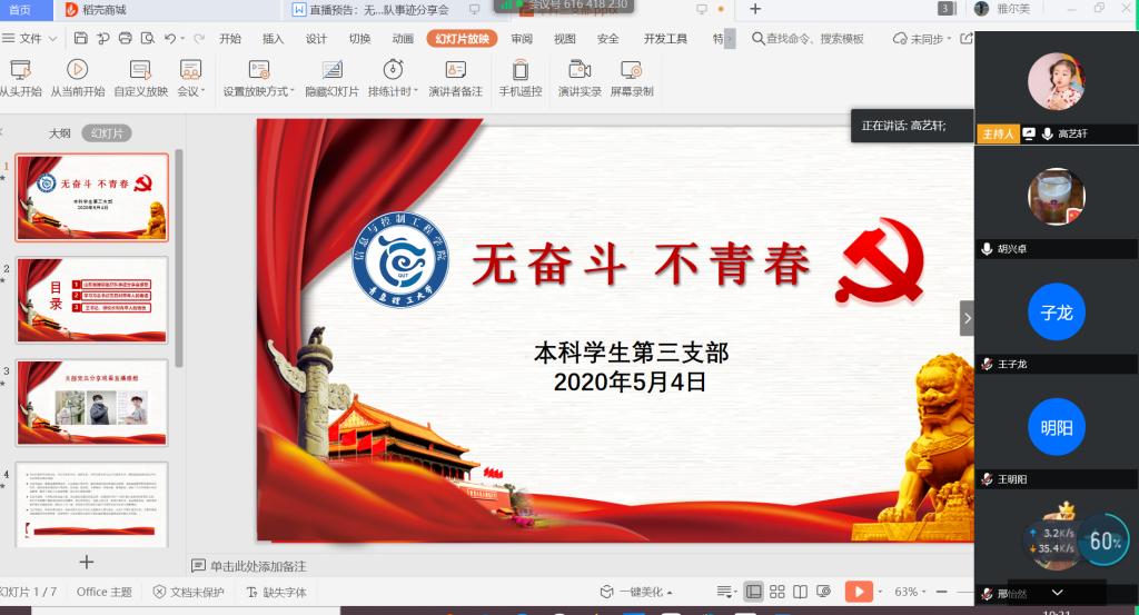 青春理想,青春活力,青春奋斗,是中国精神和中国力量的生命力所在,为号召全体党员发挥青春活动,绽放青春光彩,5月4日上午,信息与控制工程学院本科学生第三支部线上召开“无奋斗,不青春”五四青年节主题党日活动。会议由支部书记高艺轩主持,支部宣传委员薛腾飞、组织委员贾戈以及全体党员参与。本次五四青年节主题党日活动主要内容为讨论山东省援鄂医疗队事迹直播并发表观看感想、学习习近平总书记五四青年节前夕对青年人的寄语、学习校党委书记王亚军、校长谭秀森对青年学生的寄语。