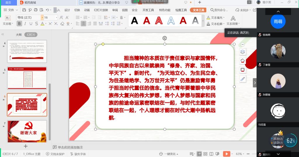 高艺轩总结指出,担当精神的本质在于责任意识与家国情怀,中华民族自古以来就崇尚“修身、齐家、治国、平天下”。作为大学生和中共党员,要树立“为天地立心、为生民立命、为往圣继绝学、为万世开太平”的崇高信念,着眼中华民族伟大复兴的伟大梦想,将个人梦想与国家和民族的前途命运紧密联结在一起,与时代主题紧密联结在一起,让个人理想在时代大潮中扬帆远航。(撰稿:丁寒雪、高艺轩;审核:曲良波)