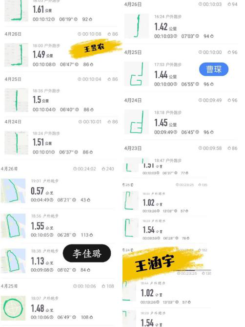 本活动采取每日线下跑步10分钟,利用app进行线上打卡,累计公里数的方式。引起了同学们的广泛关注,全院共计49个宿舍参与,总计人数达200余人。同学们以饱满的热情积极参与活动,既锻炼了身体,强健了体魄,同时又为枯燥乏味的“在家学习”时光平添了几分乐趣,更增强了宿舍凝聚力,培养了同学们力争上游的竞争意识。经过对参与活动的各宿舍跑步里程计算,最终评选出6个优胜宿舍。他们分别是: