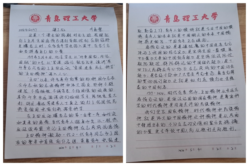 为纪念五四运动,弘扬爱国、进步、民主、科学的五四爱国主义精神,5月3日至7日,高等职业学院举办了“绽放战疫青春·坚定制度自信”主题征文比赛,2018级、2019级学生参加。