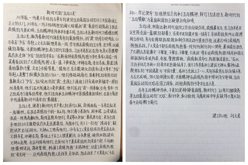 学院参赛学生将自己对五四爱国主义精神的理解以及自己的爱国主义情怀,以最真挚的文字形式表达出来,切实展现了学生的自我社会责任感和历史使命感。文章中殷切表达了学院学生把个人成长进步融入到推动祖国发展、民族振兴的时代洪流中去的期望。建工182班刘文君同学在征文中写到:101年前,一场毫不妥协的反帝反封建的五四爱国运动打开了中国新民主主义的大门,101年后,一场不怕牺牲的超大规模战“疫”爱国行动筑起了抗击疫情的万里长城,五四精神在传承中永垂不朽,五四之光在新时代下熠熠生辉。