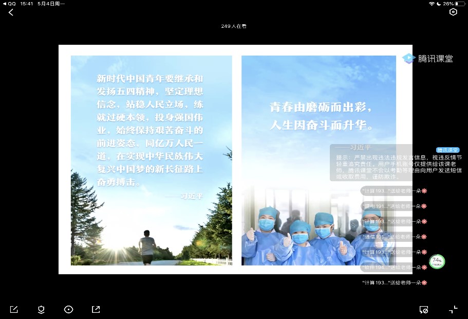 为解答青年学生情感困惑、帮助他们树立正确的婚恋观和家庭观,同时帮助准备考研的同学找到自习伙伴,信息与控制工程学院于5月1-4日举办了五四青年节主题活动。本次活动以“青春五四 线上有约”为主题,以老师授课与线上交友的形式进行,鼓励学生正确对待情感问题,迈出社交的第一步,为今后考研道路提供支持。参与本次活动的有学校各年级学生和18级辅导员王超。