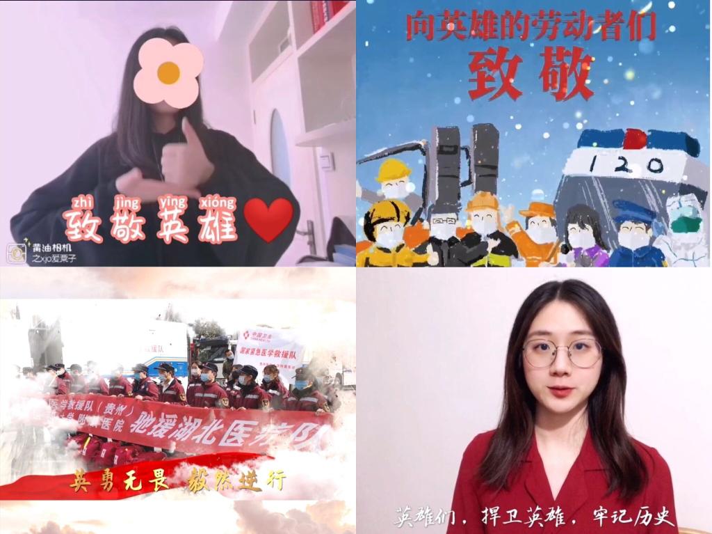其中英语181班B6-509宿舍以45秒的纯英文朗诵形式向抗疫英雄致敬;日语192班B5-1011宿舍通过手语这种特殊的方式,“说”出自己内心对英雄的钦佩之情;五四青年节时,英语182班B6-505宿舍在视频里提到,作为青年人,我们应该把英雄精神传承下去,“幸而有你,山河无恙”“捍卫英雄,牢记历史”……每一个视频都充分表达了同学们对抗疫英雄们崇高的敬意,人民没有忘记你们,国家没有忘记你们,愿逝者安息,愿生者奋发!