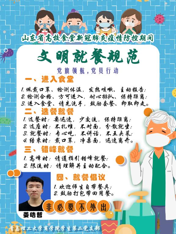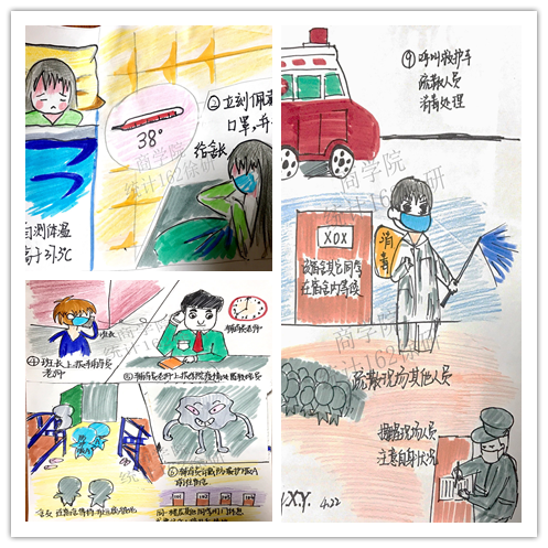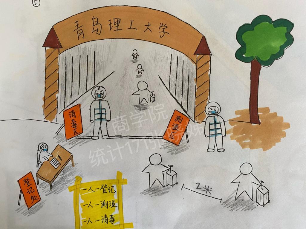 统计162班学生党员徐研是第一个报名参加培训活动的。“特别想念学校的一草一木,学校的防控演练视频和新闻我看了十几遍,每一幕都深深刻在了脑海里。我想用自己的画笔再次创作,既加深自己的印象,也给学弟学妹们提供一种生动有趣的形式来学习校园疫情防控常识”。徐研是一名标准的“学霸”,曾获得全国数学建模大赛山东赛区一等奖,而且在高中时就已通过素描十级考试。这次,她又亲手绘制了返校应知应会小漫画。