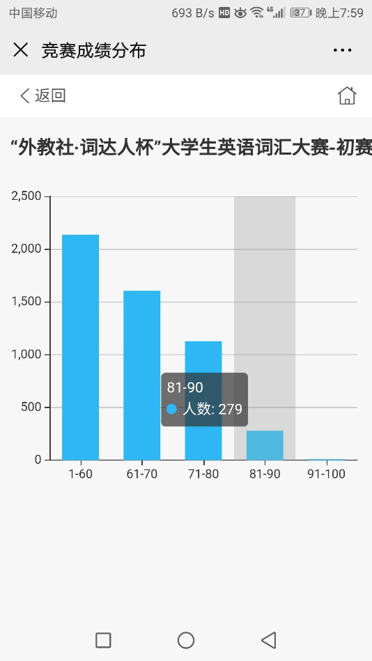 本次初赛的词汇范围为大学英语四级词汇,从初赛的结果来看,本次测试真实反映了本校非英语专业学生大学英语词汇的掌握情况。参赛学生中90分以上为9人,约占0.2%;81-90分数段为279人,约占5.4%;71-80分数段为1131人,约占21.9%;61-70分数段人数为1605人,约占31.2%;2139人得分低于60分,约占41.4%。从以上结果来看,大部分同学四级单词掌握较好,但仍有近半数的学生需要强化单词的记忆和提高英语词汇运用能力。这说明今后的大学英语教学仍需要重视英语语言基础知识,以词汇及其运用为抓手提高学生语言运用能力。本次初赛选拔出前200名学生参加词汇大赛复赛,复赛名单将在近期公布,复赛时间为5月16日晚上7-8点。