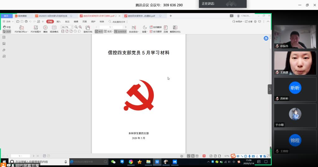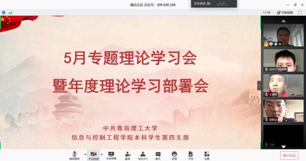 5月14日,信息与控制工程学院本科学生第四支部通过腾讯会议召开5月份专题理论学习会,部署2020年度政治理论学习安排。会议由党支部书记王超主持。