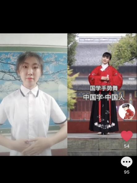 传统文化凝聚学生抗疫精气神:国商191班韩镇霞同学的二胡独奏《赛马》,其磅礴的气势、热烈的气息奏出了中华民族直面挑战、永争先锋的竞争精神;“写好中国字,做好中国人,写字要用心,做人要真诚……”商学院经贸192班李爽同学的抖音合拍视频《中国字·中国人》,简单的手势舞却溢出满满的民族自豪感。