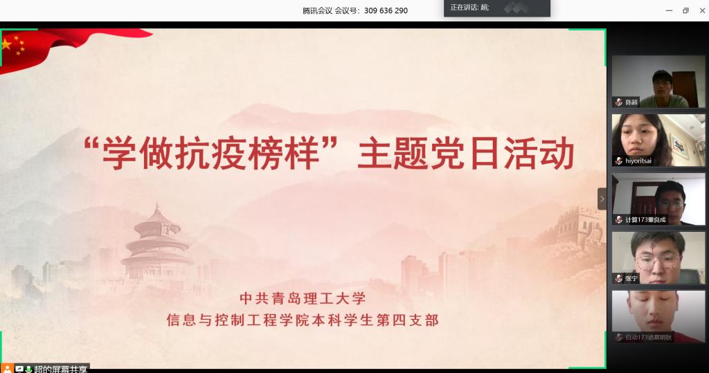 5月14日下午,信息与控制工程学院本科学生第四支部通过腾讯会议召开党员大会,开展以“学做抗疫榜样,践行党员责任”为主题的党日活动。会议由党支部书记王超主持,宣传委员高腾飞,组织委员季献涛,及支部全体党员参加。