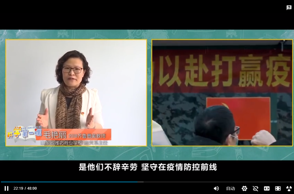 “开学第一课”通过宣传山东省在疫情防控工作中涌现的先进典型,以不同人物的“抗疫”事迹为线索,分享疫情期间的感人瞬间,展示先进典型的担当精神、奉献精神。整个节目分为“美丽逆行者”“美丽坚守者”“美丽保障者”“美丽志愿者”“美丽教育者”5个部分,通过主持人现场连线多位抗疫一线工作者,讲述不同领域不同人物的抗疫故事,分享疫情期间的感人经历与心得体会,展示先进典型的担当精神、奉献精神。同时,山东省药监局医疗器械应急组组长肖杰在节目现场回答线下同学们的提问,介绍了防疫知识和常识,为同学们的开学保驾护航。同学们在观看完《开学第一课》山东省抗疫特别节目后,都被抗疫英雄无私奉献、前仆后继的精神深深感染,收获很多。